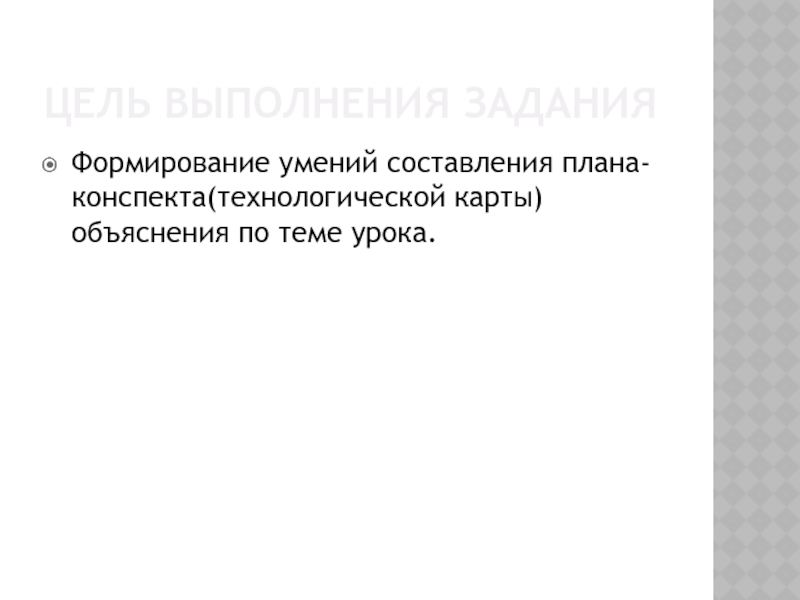 Цель ВЫПОЛНЕНИЯ ЗАДАНИЯФормирование умений составления плана-конспекта(технологической карты) объяснения по теме урока.