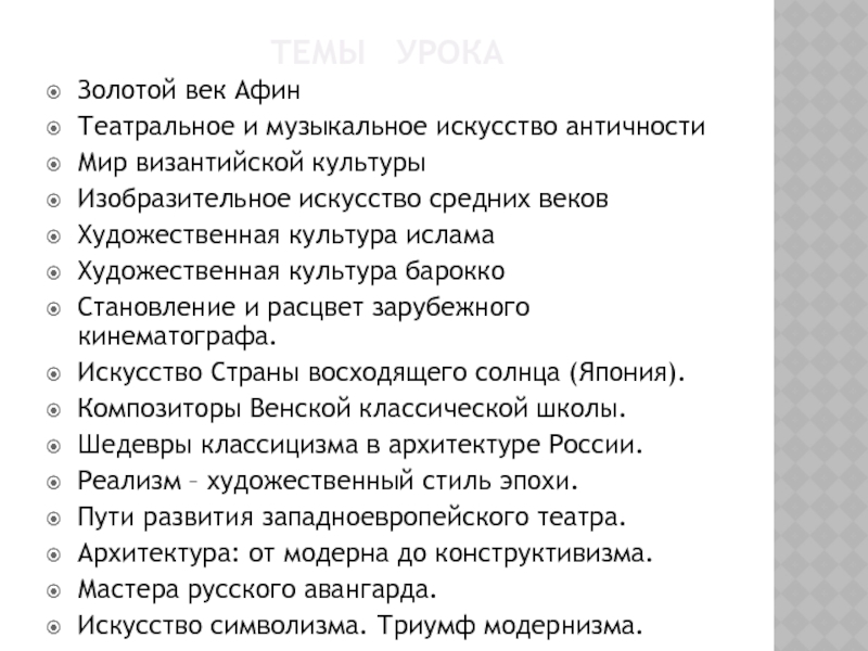 ТЕМЫ  УРОКАЗолотой век АфинТеатральное и музыкальное искусство античностиМир византийской культурыИзобразительное искусство средних вековХудожественная культура исламаХудожественная культура