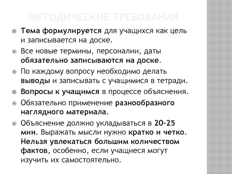 Объяснение должно укладываться в 20-25 мин. Выражать мысли нужно кратко и четко. Нельзя увлекаться большим количеством фактов, особенно, если учащиеся могут изучить их самостоятельно.