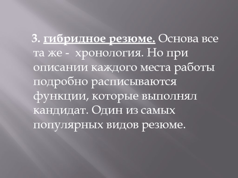 3. гибридное резюме. Основа все та же - хронология. Но при описании каждого места работы