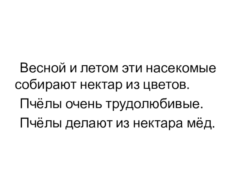 Весной и летом эти насекомые собирают нектар из цветов.Пчёлы очень трудолюбивые.Пчёлы делают из нектара мёд.