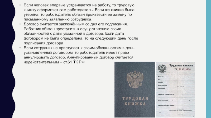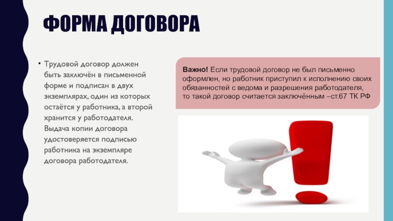 Важно! Если трудовой договор не был письменно оформлен, но работник приступил к исполнению своих обязанностей с ведома и разрешения работодателя, то такой договор считается заключённым –ст.67 ТК РФ