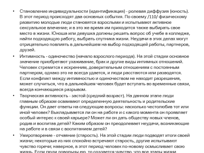 Интимность - одиночество (начало взрослого периода). На этой стадии основное значение приобретают ухаживание, брак и другие виды интимных отношений. Человек стремится к искренним, доверительным отношениям с постоянным партнером, однако это не всегда удается, и люди расстаются или разводятся. Если конфликт между интимностью и одиночеством не находит разрешения, может случиться, что в дальнейшем человек будет вступать во временные связи, всегда кончающиеся разрывом.