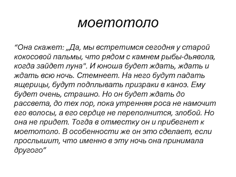 будет ждать, ждать и ждать всю ночь. Стемнеет. На него будут падать ящерицы, будут подплывать призраки в каноэ. Ему будет очень, страшно. Но он будет ждать до рассвета, до тех пор, пока утренняя роса не намочит его волосы, а его сердце не переполнится, злобой. Но она не придет. Тогда в отместку он и прибегнет к моетотоло. В особенности же он это сделает, если прослышит, что именно в эту ночь она принимала другого”