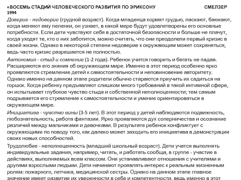 Слайд 10«ВОСЕМЬ СТАДИЙ ЧЕЛОВЕЧЕСКОГО РАЗВИТИЯ ПО ЭРИКСОНУ