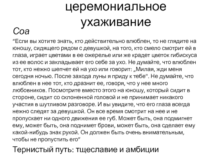 смело смотрит ей в глаза, играет цветами в ее ожерелье или же крадет цветок гибискуса из ее волос и закладывает его себе за ухо. Не думайте, что влюблен тот, кто нежно шепчет ей на ухо или говорит: „Милая, жди меня сегодня ночью. После захода луны я приду к тебе". Не думайте, что влюблен в нее тот, кто дразнит ее, говоря, что у нее много любовников. Посмотрите вместо этого на юношу, который сидит в стороне, сидит со склоненной головой и не принимает никакого участия в шутливом разговоре. И вы увидите, что его глаза всегда нежно следят за девушкой. Он все время смотрит на нее и не пропускает ни одного движения ее губ. Может быть, она подмигнет ему, может быть, она поднимет брови, может быть, она сделает ему какой-нибудь знак рукой. Он должен быть очень внимательным, чтобы не пропустить его”