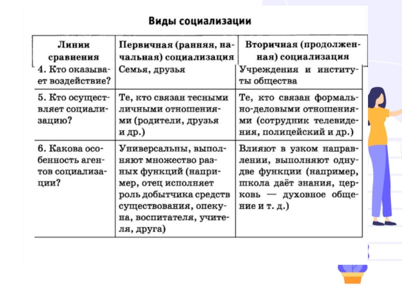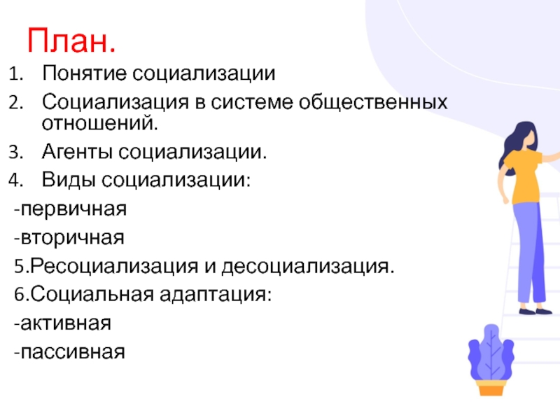 План.Понятие социализацииСоциализация в системе общественных отношений.Агенты социализации.Виды социализации:-первичная-вторичная5.Ресоциализация и десоциализация.6.Социальная адаптация:-активная-пассивная