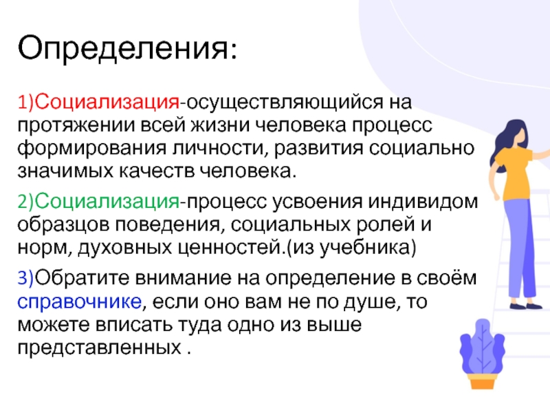 Определения:1)Социализация-осуществляющийся на протяжении всей жизни человека процесс формирования личности, развития социально значимых качеств человека.2)Социализация-процесс усвоения индивидом образцов