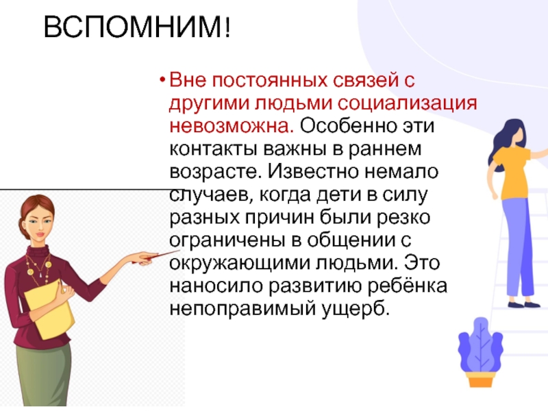 ВСПОМНИМ!Вне постоянных связей с другими людьми социализация невозможна. Особенно эти контакты важны в раннем возрасте. Известно немало