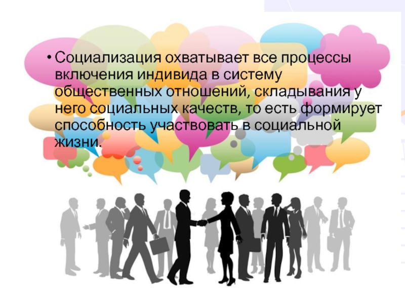 Социализация охватывает все процессы включения индивида в систему общественных отношений, складывания у него социальных качеств, то есть
