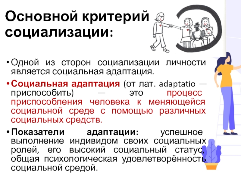 Основной критерий социализации:Одной из сторон социализации личности является социальная адаптация.Социальная адаптация (от лат. adaptatio — приспособить) —