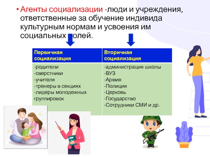 Агенты социализации -люди и учреждения, ответственные за обучение индивида культурным нормам и усвоения им социальных ролей.