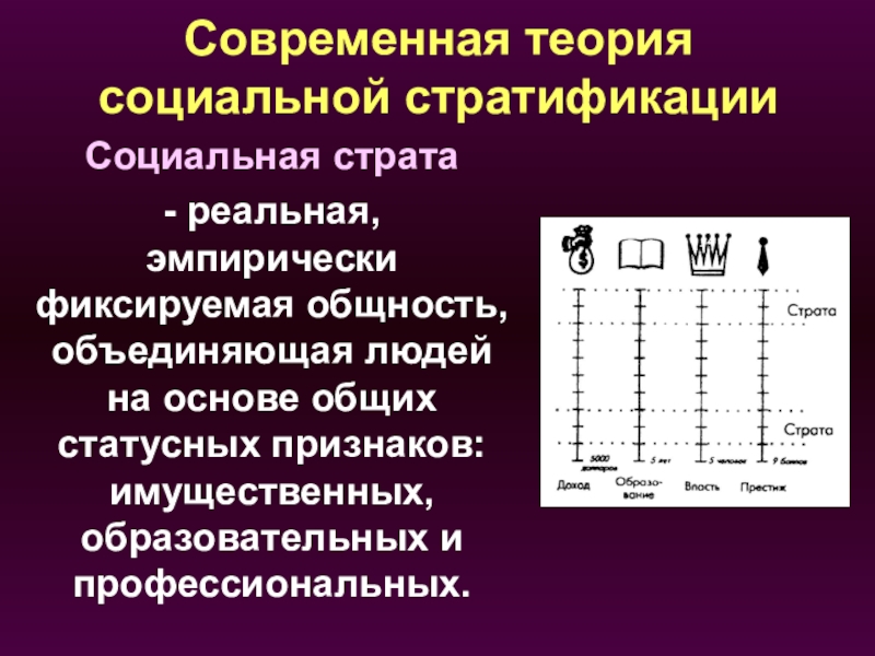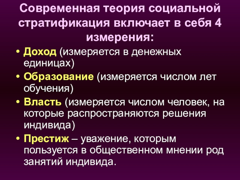 Слайд 17Современная теория социальной стратификация включает в себя 4 измерения: