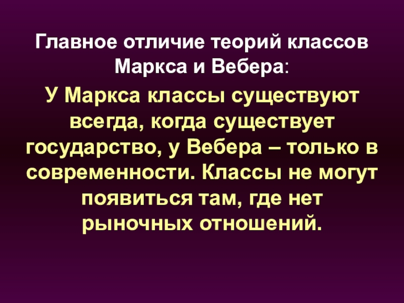 Слайд 13Главное отличие теорий классов Маркса и Вебера: