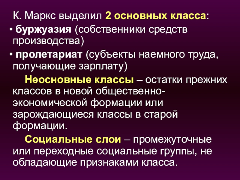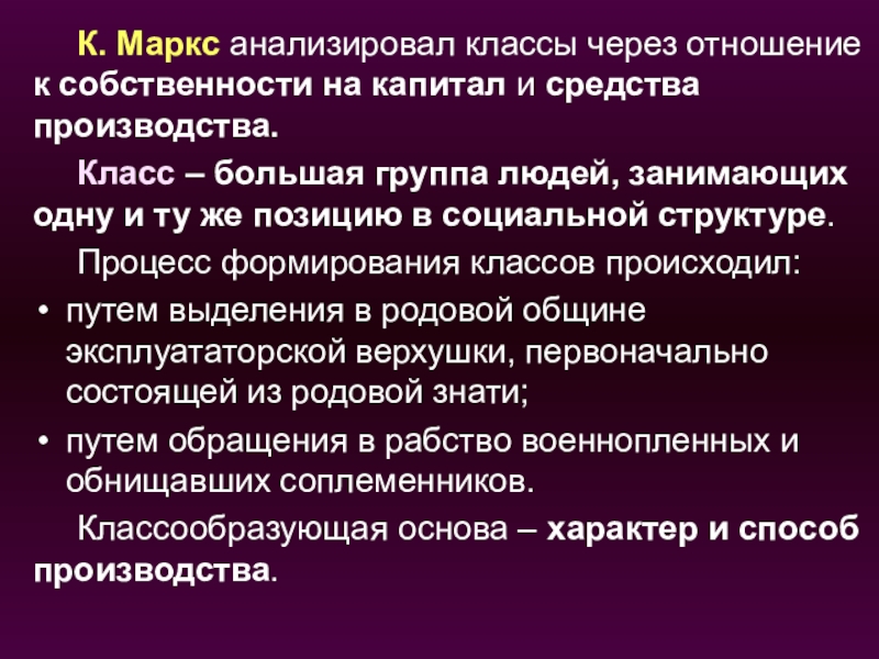 Слайд 9 К. Маркс анализировал классы через отношение к собственности на капитал