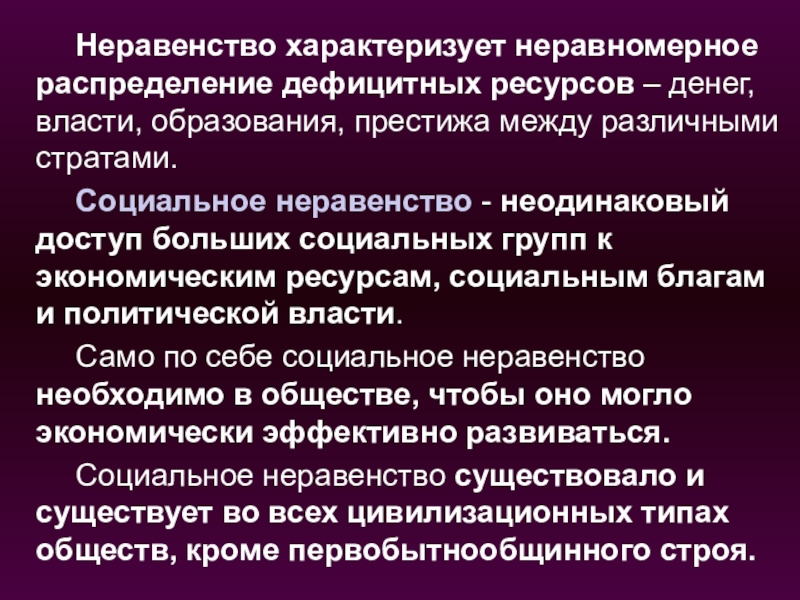 Слайд 3 Неравенство характеризует неравномерное распределение дефицитных ресурсов – денег, власти, образования,