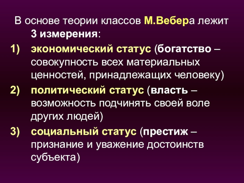 Слайд 11В основе теории классов М.Вебера лежит 3 измерения: