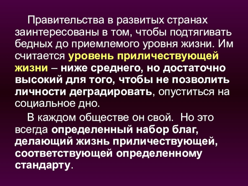 до приемлемого уровня жизни. Им считается уровень приличествующей жизни –