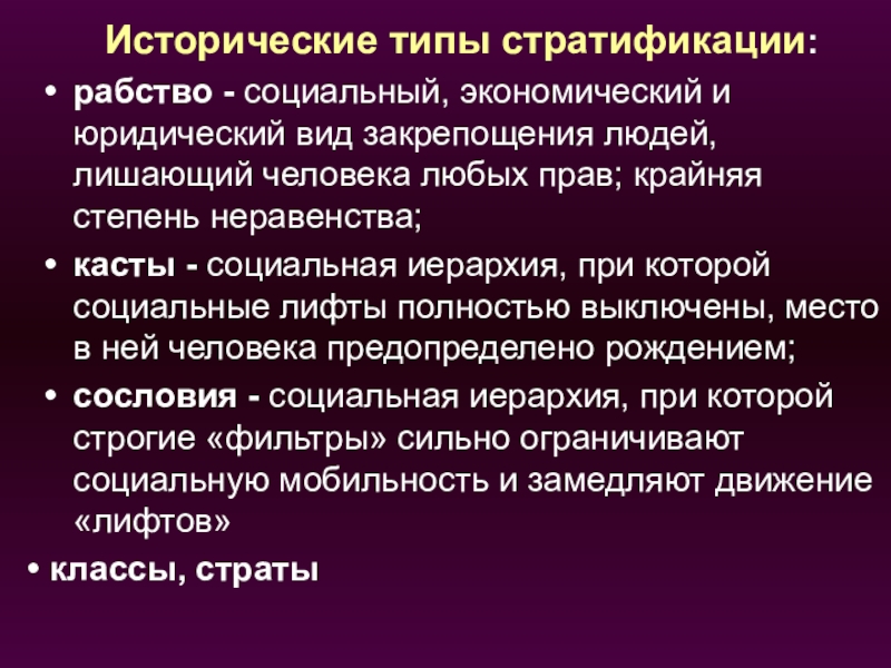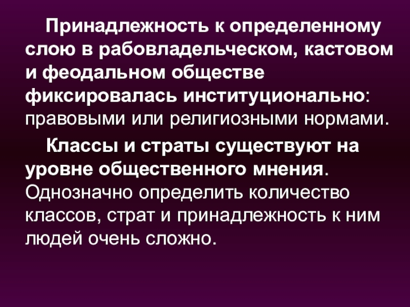 Слайд 7 Принадлежность к определенному слою в рабовладельческом, кастовом и феодальном обществе