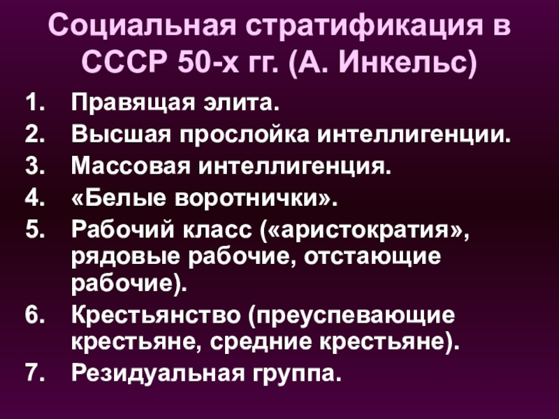 Слайд 24Социальная стратификация в СССР 50-х гг. (А. Инкельс)