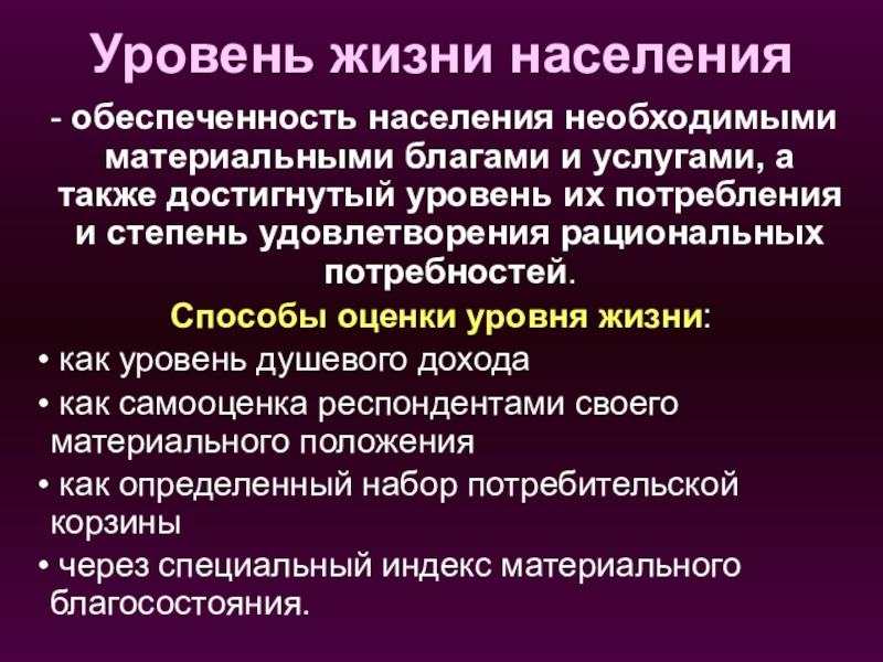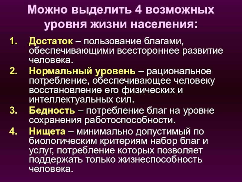 Слайд 31Можно выделить 4 возможных уровня жизни населения:
