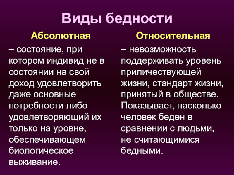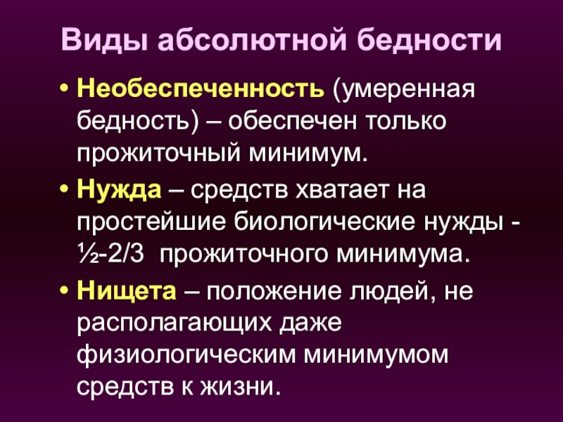 Нищета – минимально допустимый по биологическим критериям набор благ и услуг, потребление которых позволяет поддержать только жизнеспособность человека.