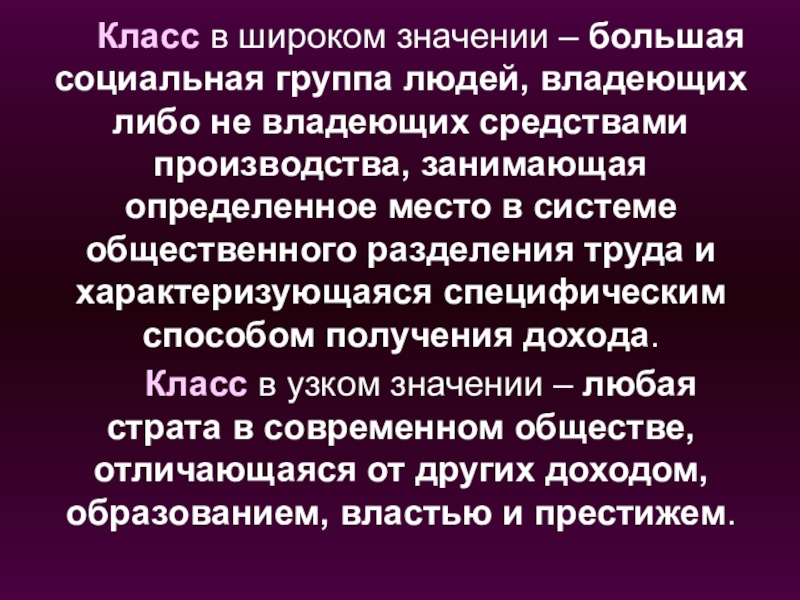 Класс в узком значении – любая страта в современном обществе, отличающаяся от других доходом, образованием, властью и престижем.