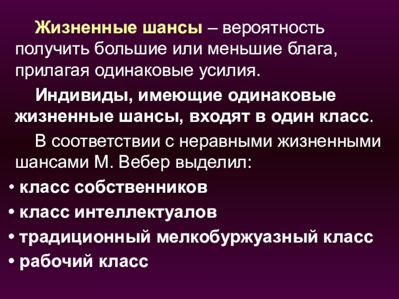 соответствии с неравными жизненными шансами М. Вебер выделил: