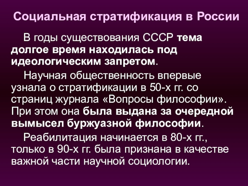 стратификации в 50-х гг. со страниц журнала «Вопросы философии». При этом она была выдана за очередной вымысел буржуазной философии.