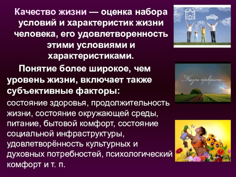 Слайд 33Качество жизни — оценка набора условий и характеристик жизни человека, его