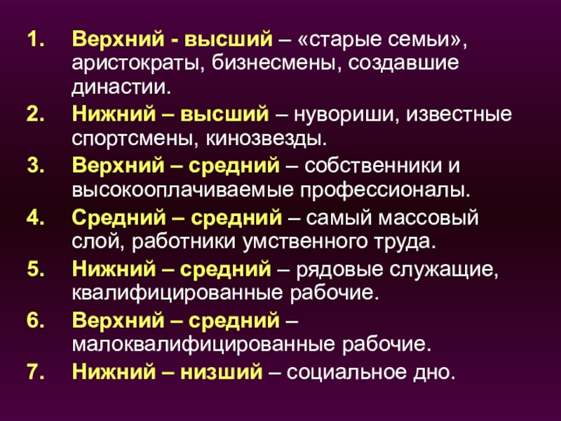 Слайд 21Верхний - высший – «старые семьи», аристократы, бизнесмены, создавшие династии.