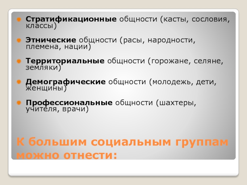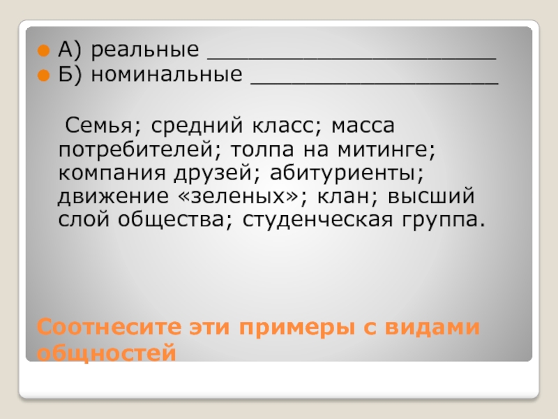 компания друзей; абитуриенты; движение «зеленых»; клан; высший слой общества; студенческая группа.