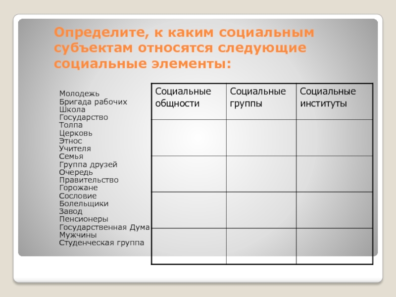 Слайд 38Определите, к каким социальным субъектам относятся следующие социальные элементы: