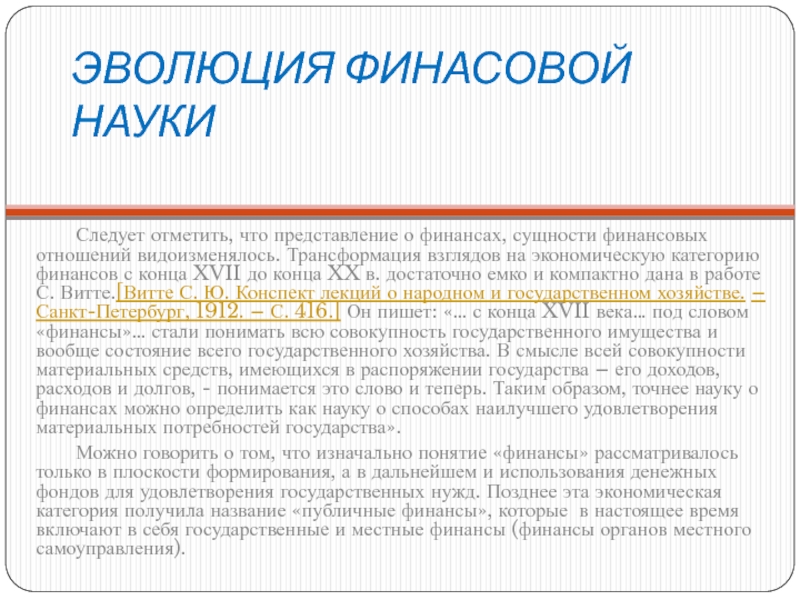 XVII до конца XX в. достаточно емко и компактно дана в работе С. Витте.[Витте С. Ю. Конспект лекций о народном и государственном хозяйстве. – Санкт-Петербург, 1912. – С. 416.] Он пишет: «… с конца XVII века… под словом «финансы»… стали понимать всю совокупность государственного имущества и вообще состояние всего государственного хозяйства. В смысле всей совокупности материальных средств, имеющихся в распоряжении государства – его доходов, расходов и долгов, - понимается это слово и теперь. Таким образом, точнее науку о финансах можно определить как науку о способах наилучшего удовлетворения материальных потребностей государства».