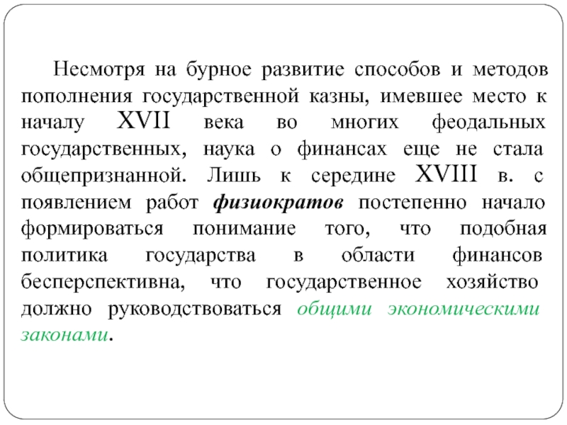 феодальных государственных, наука о финансах еще не стала общепризнанной. Лишь к середине XVIII в. с появлением работ физиократов постепенно начало формироваться понимание того, что подобная политика государства в области финансов бесперспективна, что государственное хозяйство должно руководствоваться общими экономическими законами.