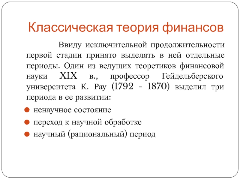 ведущих теоретиков финансовой науки XIX в., профессор Гейдельберского университета К. Рау (1792 - 1870) выделил три периода в ее развитии: