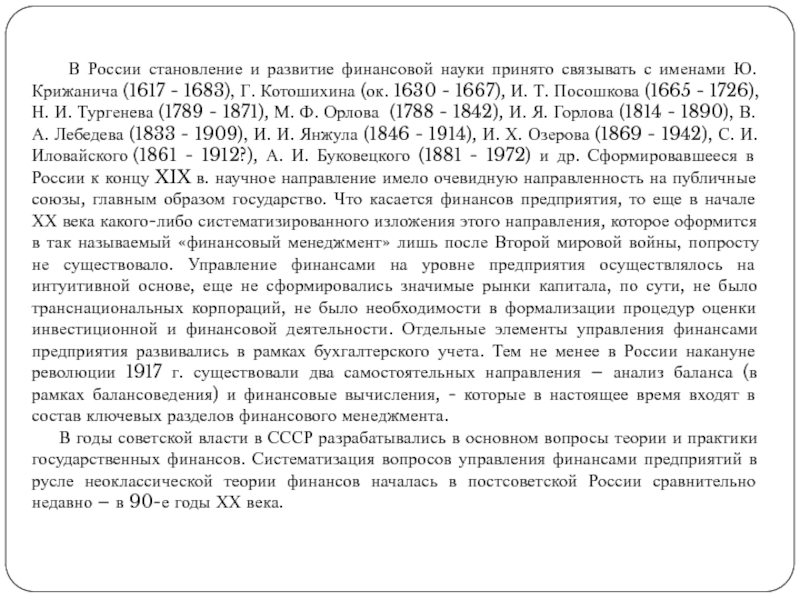 Котошихина (ок. 1630 - 1667), И. Т. Посошкова (1665 - 1726), Н. И. Тургенева (1789 - 1871), М. Ф. Орлова (1788 - 1842), И. Я. Горлова (1814 - 1890), В. А. Лебедева (1833 - 1909), И. И. Янжула (1846 - 1914), И. Х. Озерова (1869 - 1942), С. И. Иловайского (1861 - 1912?), А. И. Буковецкого (1881 - 1972) и др. Сформировавшееся в России к концу XIX в. научное направление имело очевидную направленность на публичные союзы, главным образом государство. Что касается финансов предприятия, то еще в начале ХХ века какого-либо систематизированного изложения этого направления, которое оформится в так называемый «финансовый менеджмент» лишь после Второй мировой войны, попросту не существовало. Управление финансами на уровне предприятия осуществлялось на интуитивной основе, еще не сформировались значимые рынки капитала, по сути, не было транснациональных корпораций, не было необходимости в формализации процедур оценки инвестиционной и финансовой деятельности. Отдельные элементы управления финансами предприятия развивались в рамках бухгалтерского учета. Тем не менее в России накануне революции 1917 г. существовали два самостоятельных направления – анализ баланса (в рамках балансоведения) и финансовые вычисления, - которые в настоящее время входят в состав ключевых разделов финансового менеджмента.