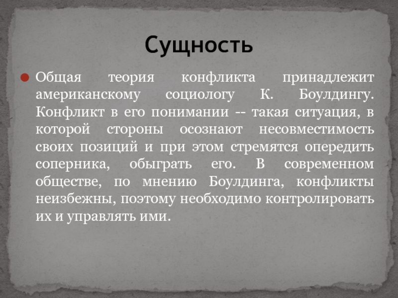 в целом, которая характеризуется столкновением противоположно направленных интересов, целей, позиций субъектов взаимодействия. Конфликты могут быть скрытыми или явными, но в их основе всегда лежит отсутствие согласия между двумя или более сторонами.Понятие