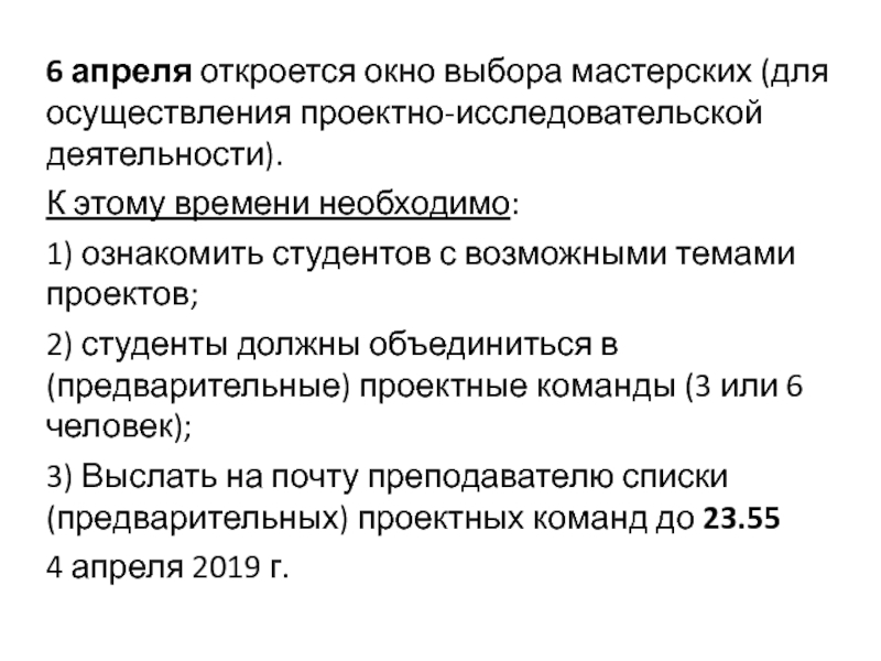Слайд 106 апреля откроется окно выбора мастерских (для осуществления проектно-исследовательской деятельности).