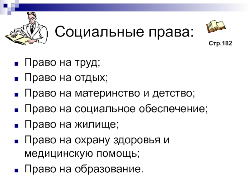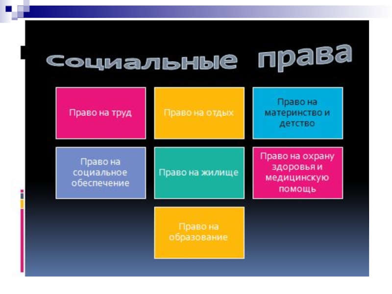 Социальные права:Право на труд;Право на отдых;Право на материнство и детство;Право на социальное обеспечение;Право на жилище;Право на охрану