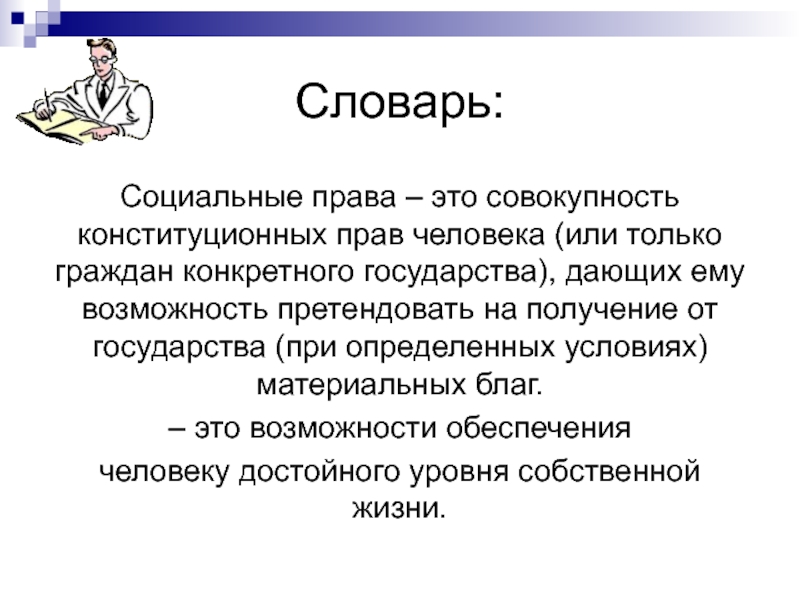 Словарь:Социальные права – это совокупность конституционных прав человека (или только граждан конкретного государства), дающих ему возможность претендовать