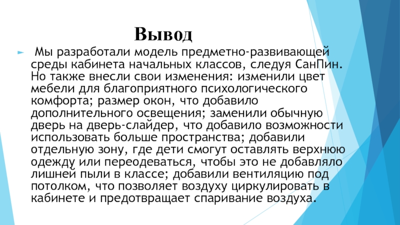 Вывод Мы разработали модель предметно-развивающей среды кабинета начальных классов, следуя СанПин. Но также внесли свои изменения: изменили