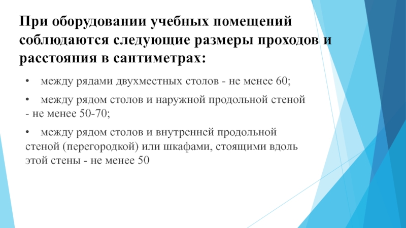 Слайд 3При оборудовании учебных помещений соблюдаются следующие размеры проходов и расстояния