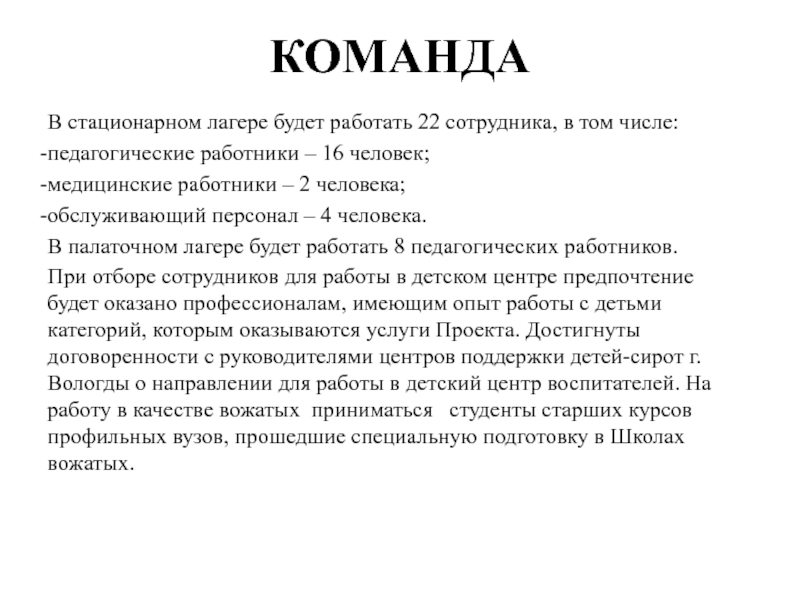 В стационарном лагере будет работать 22 сотрудника, в том числе: