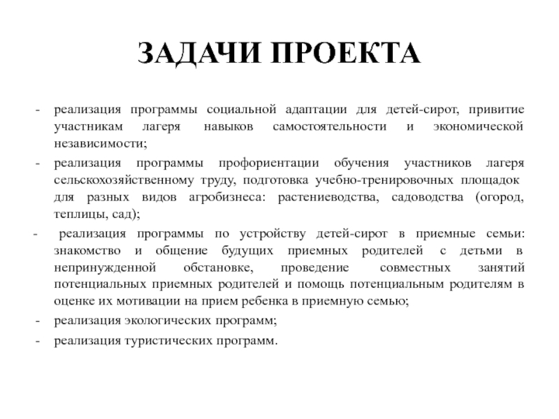 проблему детского отдыха для детей, находящихся трудной жизненной ситуации, а также поможет детям-сиротам: в устройстве в приемные семьи, в социальной адаптации к жизни после выпуска из детских учреждений и профориентации через тренинги, мастер-классы и изучение профессий агробизнеса. Дети смогут полноценно и с пользой для себя отдохнуть, принимая участие в различных интересных мероприятиях во время тематических смен.