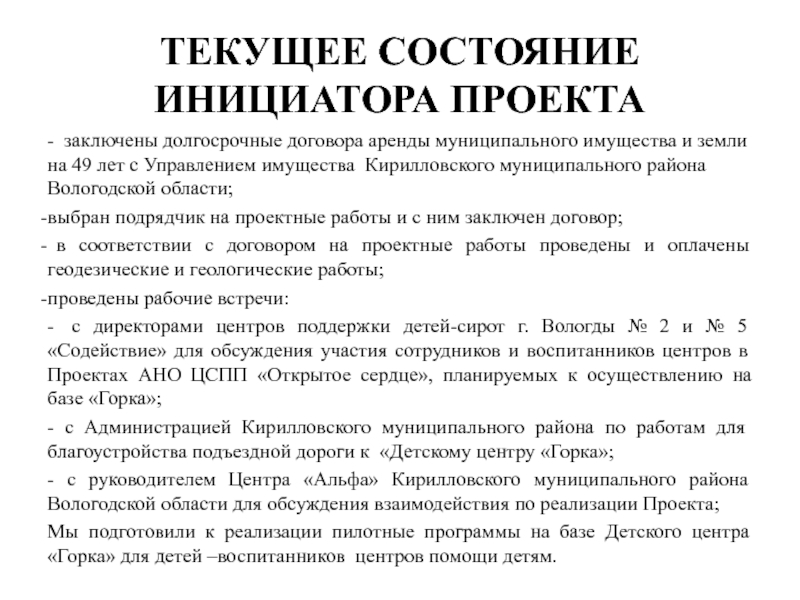 Слайд 15ТЕКУЩЕЕ СОСТОЯНИЕ ИНИЦИАТОРА ПРОЕКТА