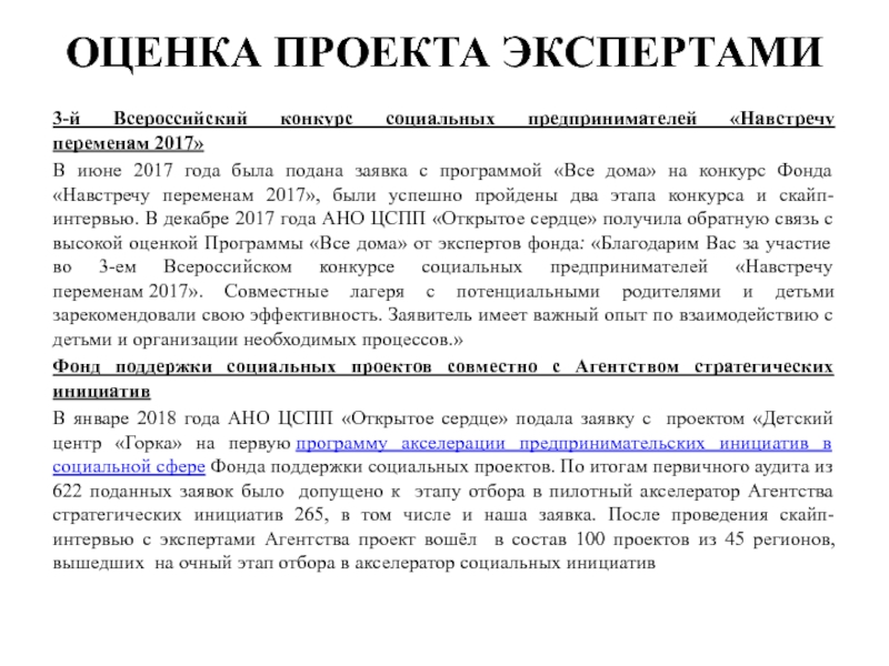 В январе 2018 года АНО ЦСПП «Открытое сердце» подала заявку с проектом «Детский центр «Горка» на первую программу акселерации предпринимательских инициатив в социальной сфере Фонда поддержки социальных проектов. По итогам первичного аудита из 622 поданных заявок было допущено к этапу отбора в пилотный акселератор Агентства стратегических инициатив 265, в том числе и наша заявка. После проведения скайп-интервью с экспертами Агентства проект вошёл в состав 100 проектов из 45 регионов, вышедших на очный этап отбора в акселератор социальных инициатив