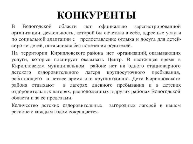 На территории Кирилловского района нет организаций, оказывающих услуги, которые планирует оказывать Центр. В настоящее время в Кирилловском муниципальном районе нет ни одного стационарного детского оздоровительного лагеря круглосуточного пребывания, работающего в летнее время или круглогодично. Дети Кирилловского района отдыхают в лагерях дневного пребывания и в детских оздоровительных лагерях, расположенных в других районах Вологодской области и за её пределами.