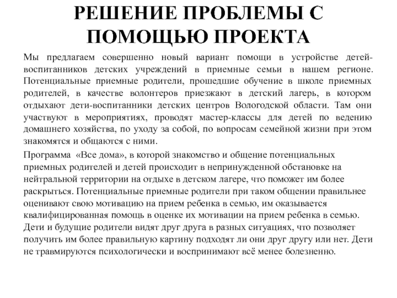 Программа «Все дома», в которой знакомство и общение потенциальных приемных родителей и детей происходит в непринужденной обстановке на нейтральной территории на отдыхе в детском лагере, что поможет им более раскрыться. Потенциальные приемные родители при таком общении правильнее оценивают свою мотивацию на прием ребенка в семью, им оказывается квалифицированная помощь в оценке их мотивации на прием ребенка в семью. Дети и будущие родители видят друг друга в разных ситуациях, что позволяет получить им более правильную картину подходят ли они друг другу или нет. Дети не травмируются психологически и воспринимают всё менее болезненно.