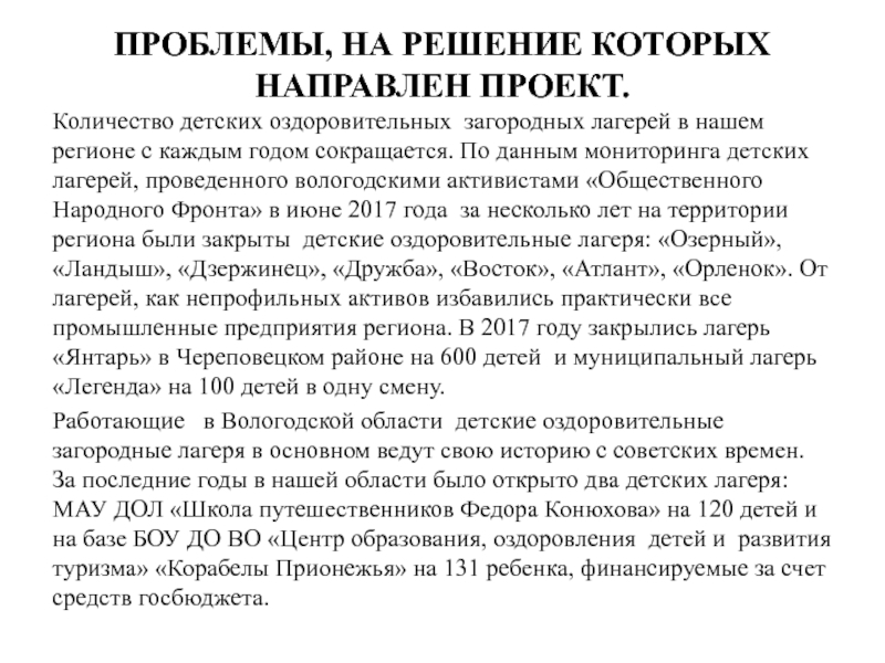 детских лагерей, проведенного вологодскими активистами «Общественного Народного Фронта» в июне 2017 года за несколько лет на территории региона были закрыты детские оздоровительные лагеря: «Озерный», «Ландыш», «Дзержинец», «Дружба», «Восток», «Атлант», «Орленок». От лагерей, как непрофильных активов избавились практически все промышленные предприятия региона. В 2017 году закрылись лагерь «Янтарь» в Череповецком районе на 600 детей и муниципальный лагерь «Легенда» на 100 детей в одну смену.
